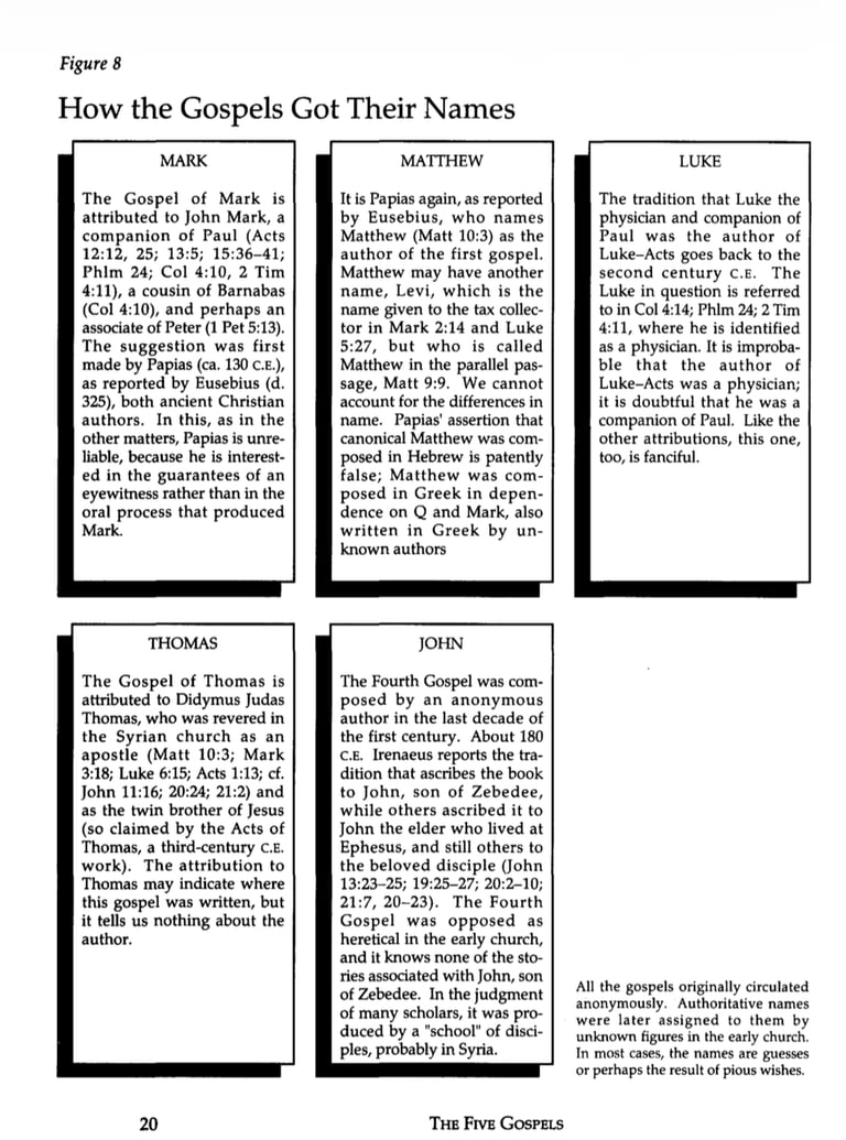 Source: Robert W. Funk, The Five Gospels: What Did Jesus Really Say? The Search for the Authentic Words of Jesus, P.20